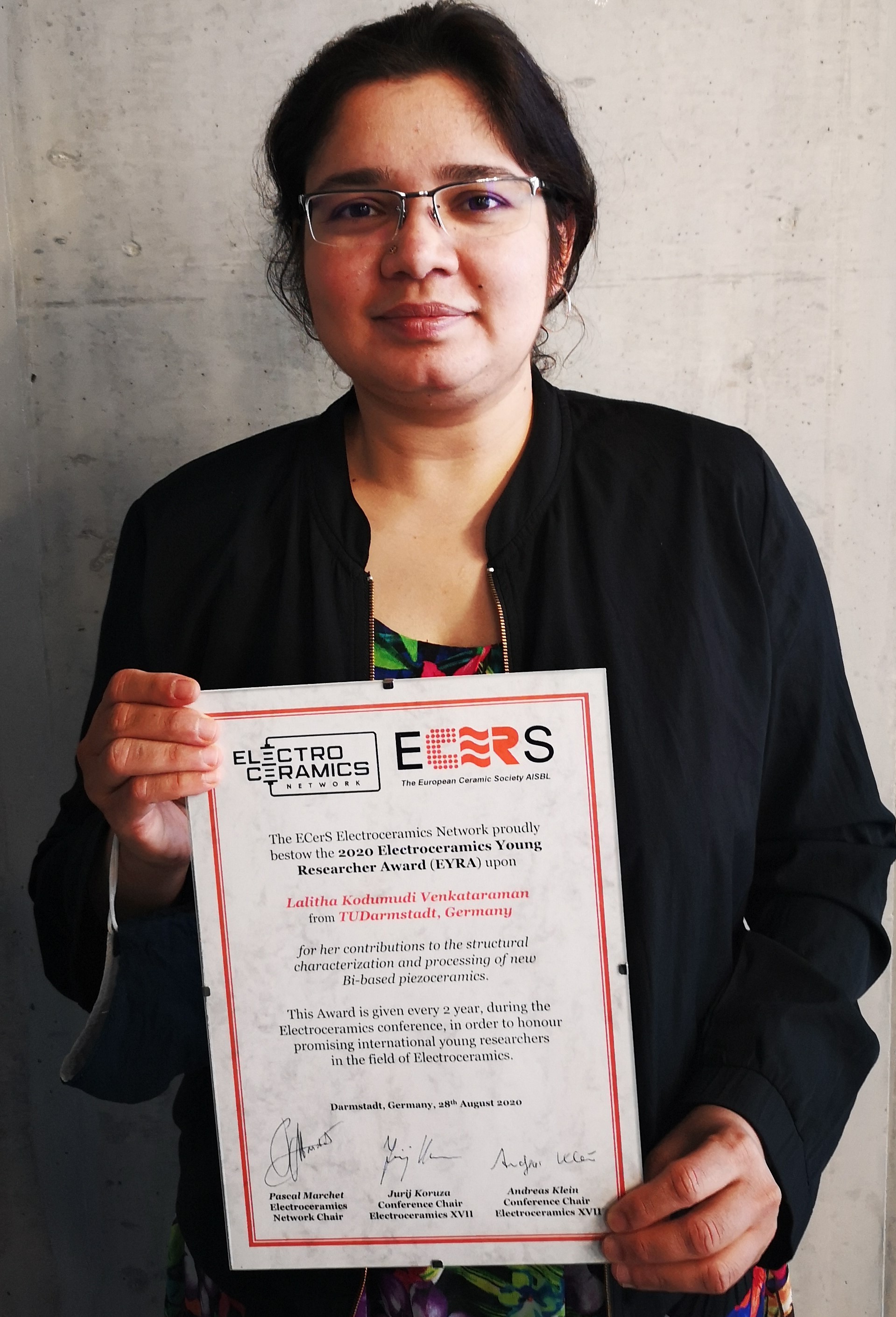 The first Electroceramics Young Researcher Award (EYRA) was also rewarded during this conference toLalitha Kodumudi Venkataraman from TUDarmstadt, Germany, for her contributions to the structural characterization and processing of new Bi-based piezoceramics. This Award will be given every 2 year, during the Electroceramics conference, in order to honour promising international young researchers in the field of Electroceramics.